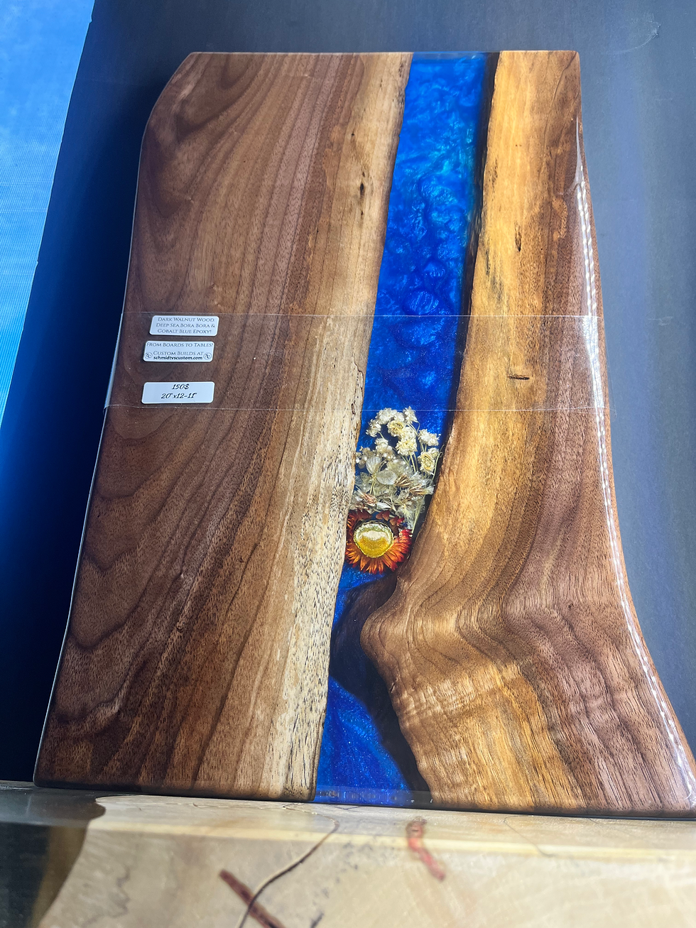 Wide selection of product from awesome laser engraved products to massive epoxy charcuterie boards and even furniture pieces!